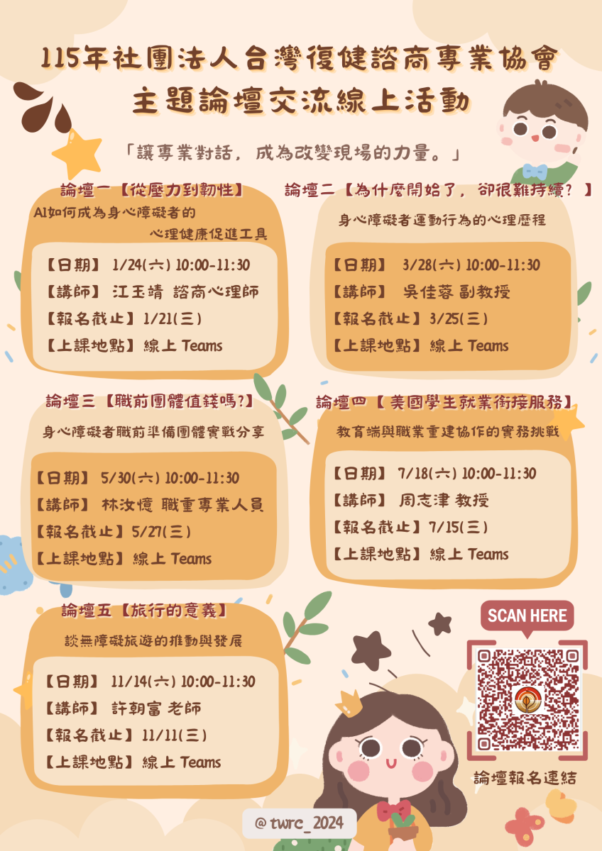 2026年,本協會再度推出全新一年的「線上主題論壇系列」,以更貼近現場、更回應趨勢的方式,陪伴專業人員共同拓展復健諮商的可能性。今年的五場論壇橫跨實務技術、專業發展與社會參與三大方向,期望為您帶來更全面、更有深度的專業視野。 本系列活動旨在深化復健諮商領域的專業交流,促進跨單位、跨領域的實務對話,也期待提供一個友善且開放的學習空間,讓參與者能自在吸收新知、分享經驗、串連資源。每一場論壇皆由具備實務底蘊或專長研究的講者帶領,聚焦於專業人員在現場會遇到的真實需求。 誠摯期待您的踴躍參與!! 本系列線上主題論壇,共有5個場次,可單獨報名,也歡迎同時報名參與喔 (同時報名優惠喔)!! 備註:所有課程皆會申請職業重建繼續教育時數。