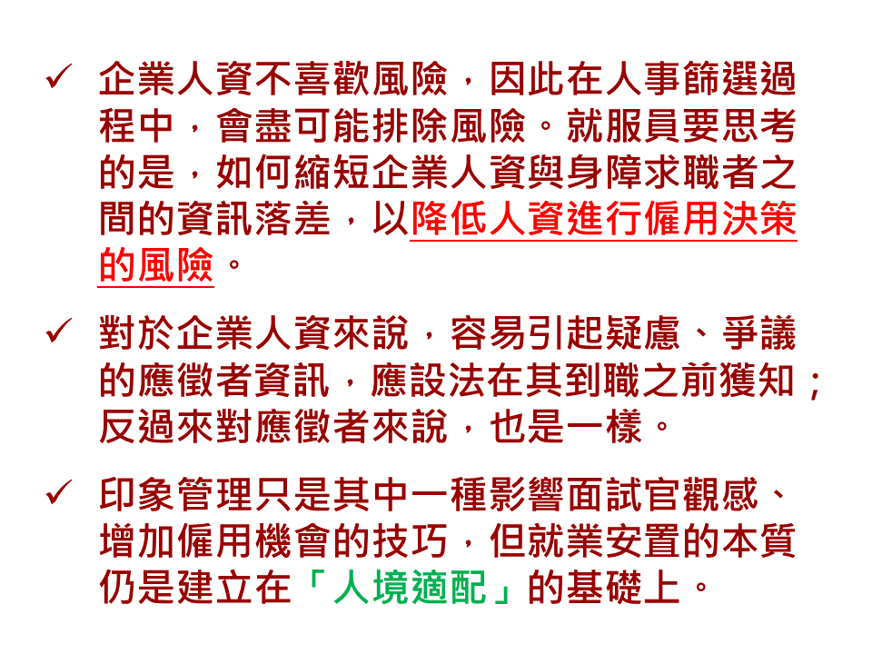 - 2.為個案的形象與障礙狀況進行包裝(或說明/美化/修飾)有其必要性,前提是就服員要先透過專業判斷,確認個案的能力和特質適合職場的條件要求。所以,包裝要「適度」,但不能「過度」。